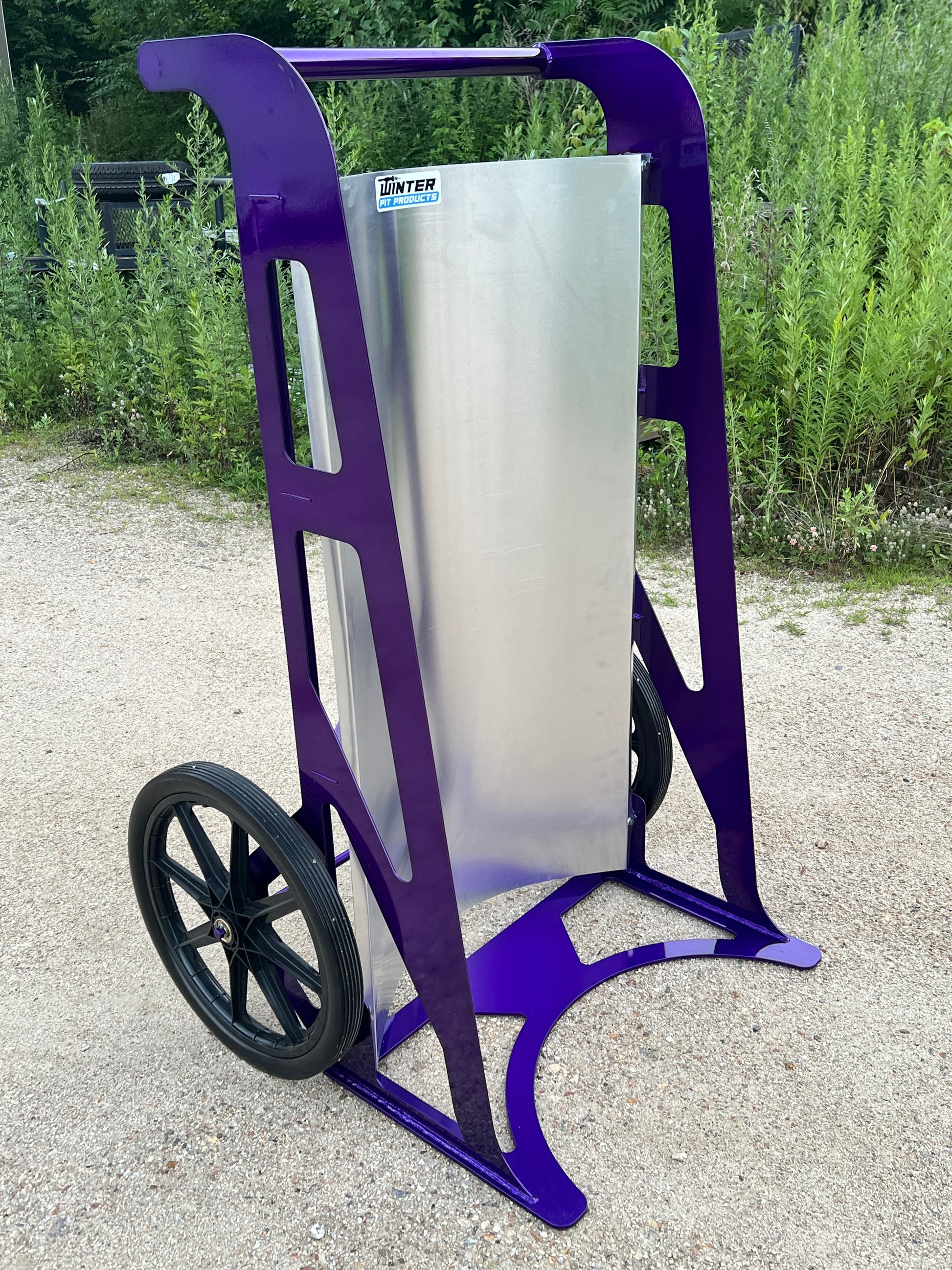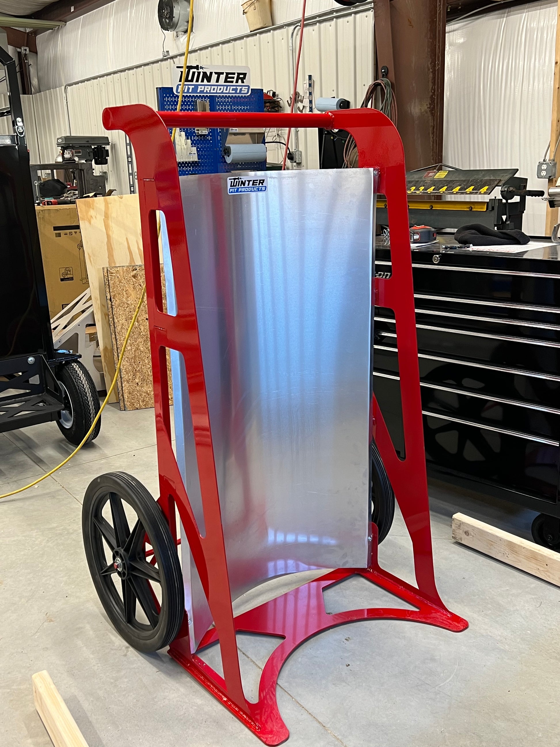 We are proud to introduce our 2 wheel tire cart. These tire carts have the ability to hold 4 racing tires upright. The tire cart features a no tip design. This benefits for when being used on uneven terrain. We add .040 aluminum to the back of the tire cart to prevent unmounted rims from falling through. These tire carts come standard in a painted finish. A powder coated option is available as an upgrade.